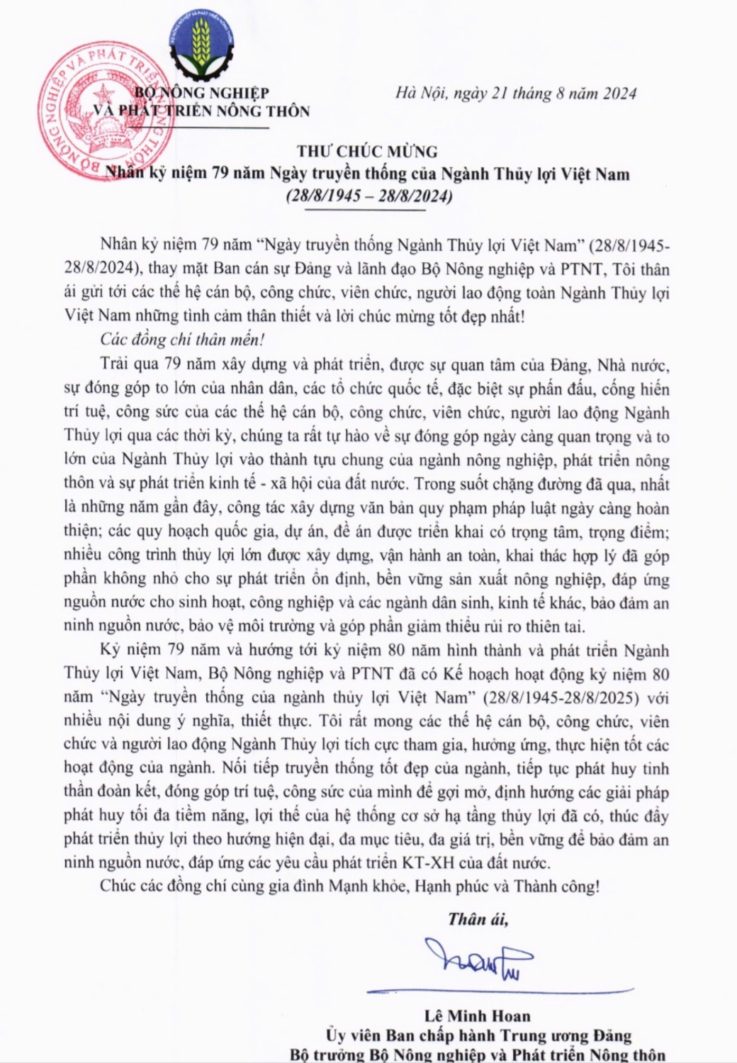 Thư của Quyền Bộ trưởng Bộ Nông nghiệp và Môi trường chúc mừng Kỷ niệm 80 năm ngày truyền thống của Ngành Thủy lợi Việt Nam