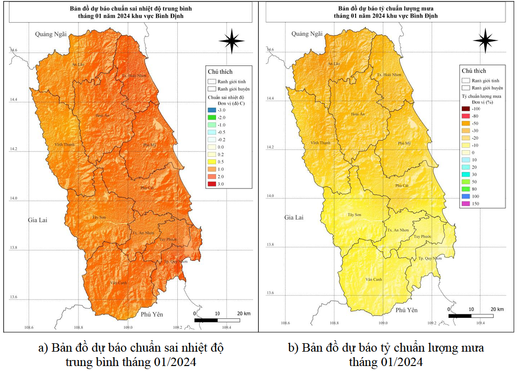 Khả năng không có Xoáy thuận nhiệt đới hoạt động trên Biển Đông. Trong tháng 01/2024 không khí lạnh có xu hướng hoạt động yếu hơn so với TBNN cùng thời kỳ, khả năng có khoảng 3 - 4 đợt ảnh hưởng đến Bình Định.