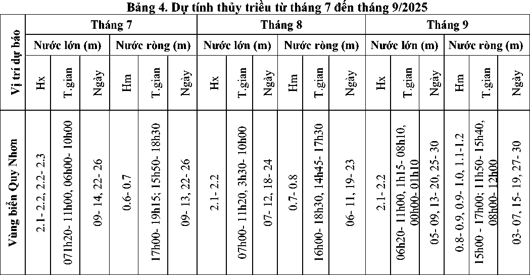 Hải văn: Vùng ven biển khu vực Bình Định cần lưu ý đề phòng sóng lớn kết hợp với nước dâng do ảnh hưởng của bão, áp thấp nhiệt đới và gió mùa tây nam hoạt động mạnh tại khu vực. Mực nước ven biển chủ yếu dao động theo thủy triều và ở mức trung bình nhiều năm cùng kỳ. Từ tháng 7 đến tháng 9/2025 vùng biển Bình Định có 9 đợt triều cường (trong đó có 02 đợt triều cường cao xuất hiện vào cuối tháng 7 và giữa tháng 9). Mực nước đỉnh triều cao nhất tại Quy Nhơn ở mức 2,2 - 2,3m; các đợt triều cường này nếu trùng vào thời kỳ gió mùa Tây Nam sẽ gây nguy cơ cao sạt lở bờ biển, vùng cửa sông và ngập úng vùng trũng thấp.