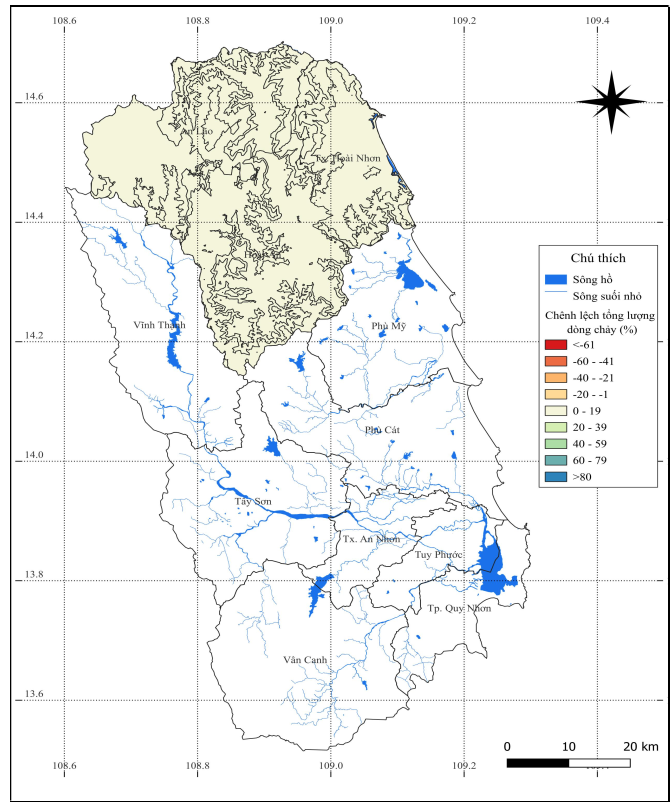 Hình 1. Bản đồ hiện trạng chênh lệch tổng lượng dòng chảy mặt so với TBNN