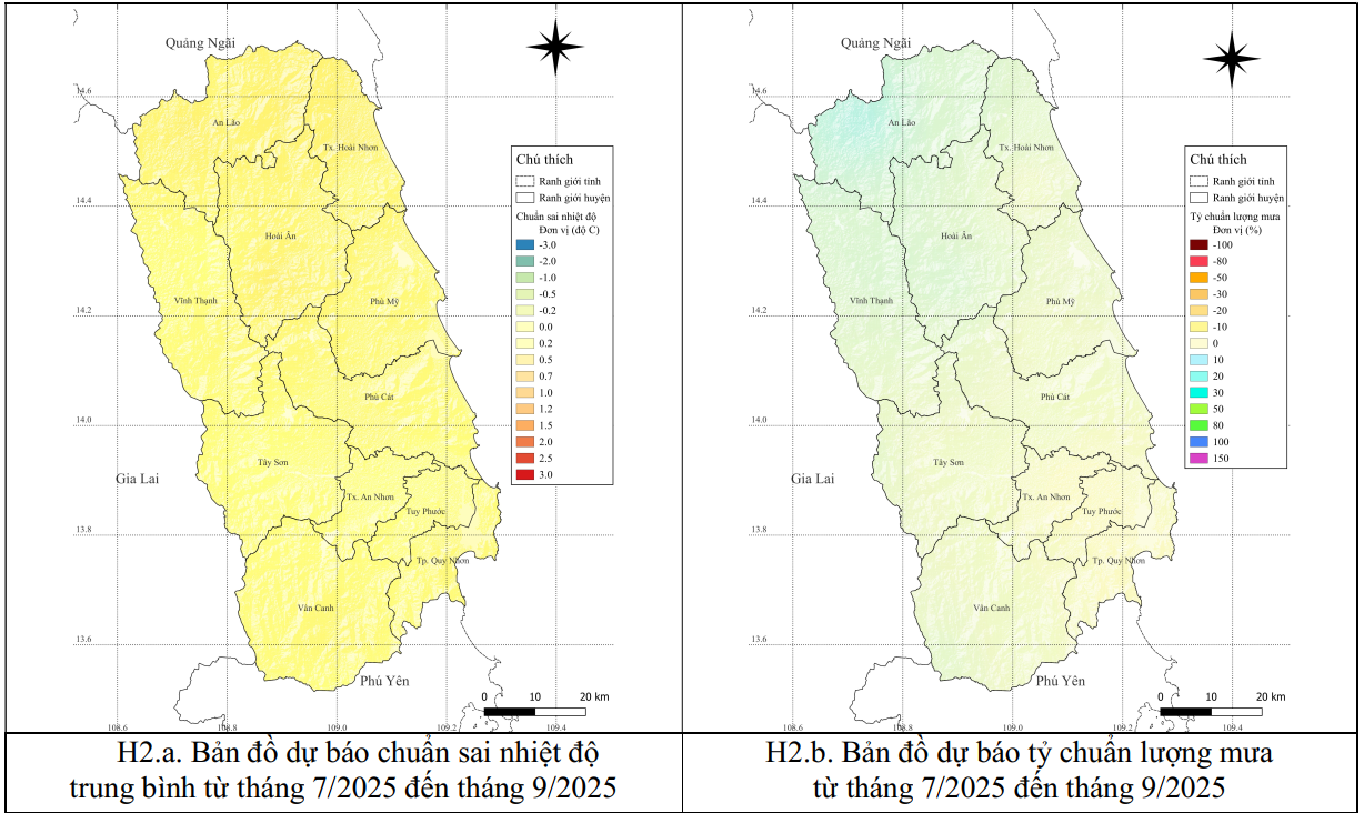 Tình hình mưa: Tháng 7-9/2025: TLM khu vực tỉnh Bình Định phổ biến ở mức xấp xỉ TBNN cùng kỳ (Lượng mưa TBNN: tháng 7 từ 50 - 80mm, riêng vùng núi từ 130 - 160mm; tháng 8 từ 80 - 120mm, riêng vùng núi từ 150 - 180mm; tháng 9 từ 220 - 270mm, vùng núi từ 270 - 330mm).