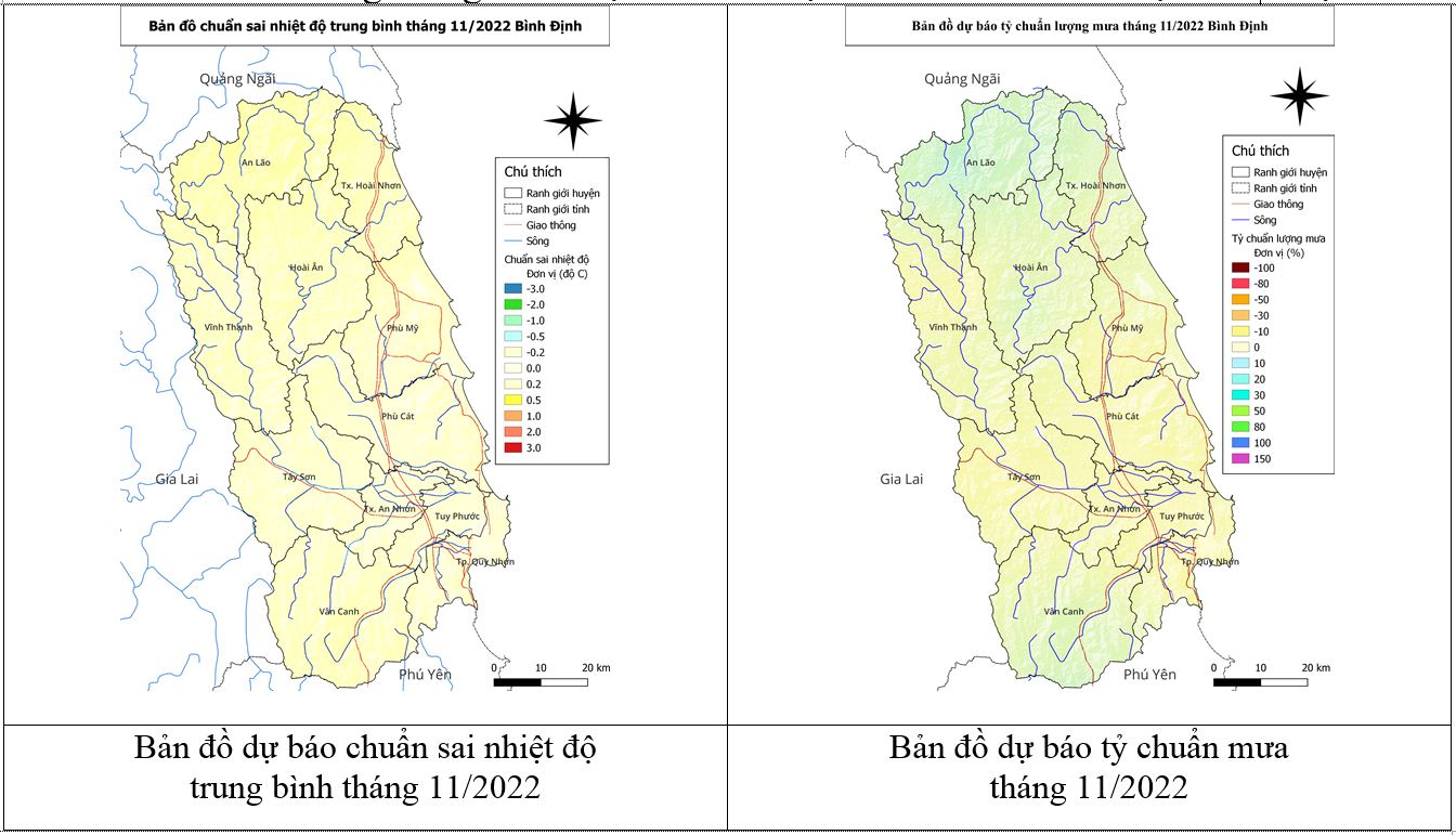 - Chuẩn sai: giá trị nhiệt độ/lượng mưa chênh lệch so với TBNN (đơn vị: độ C/milimét).