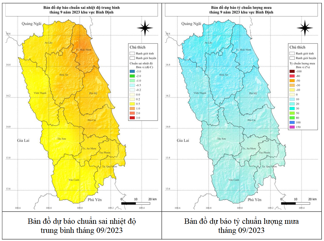 Tháng 8/2023 thời tiết khu vực Bình Định chịu ảnh hưởng chủ yếu của rìa phía nam rãnh áp thấp, rìa đông nam vùng áp thấp nóng phía tây, những ngày cuối tháng chịu ảnh hưởng của dải hội tụ nhiệt đới nối với cơn bão số 3 đang hoạt động trên biển Đông, đới gió tây nam cường độ trung bình đến mạnh, trên cao là rìa tây nam hoàn lưu áp cao cận nhiệt đới. Các thời kỳ trong tháng mây thay đổi đến nhiều mây, không mưa hoặc chiều tối và đêm có mưa rào và dông vài nơi, riêng các ngày 02, 17, 31 có mưa rào và rải rác có dông, ngày nắng, có nhiều ngày nắng nóng và nắng nóng gay gắt, số ngày nắng nóng Hoài Nhơn 27 ngày, An Nhơn 23 ngày, Quy Nhơn 21 ngày.