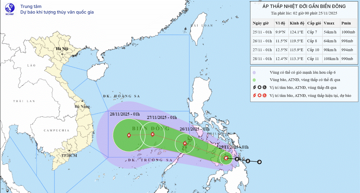 Hình 1. Bản đồ dự báo quỹ đạo và cường độ áp thấp nhiệt đới phát lúc 02h00 ngày 25/11/2025
