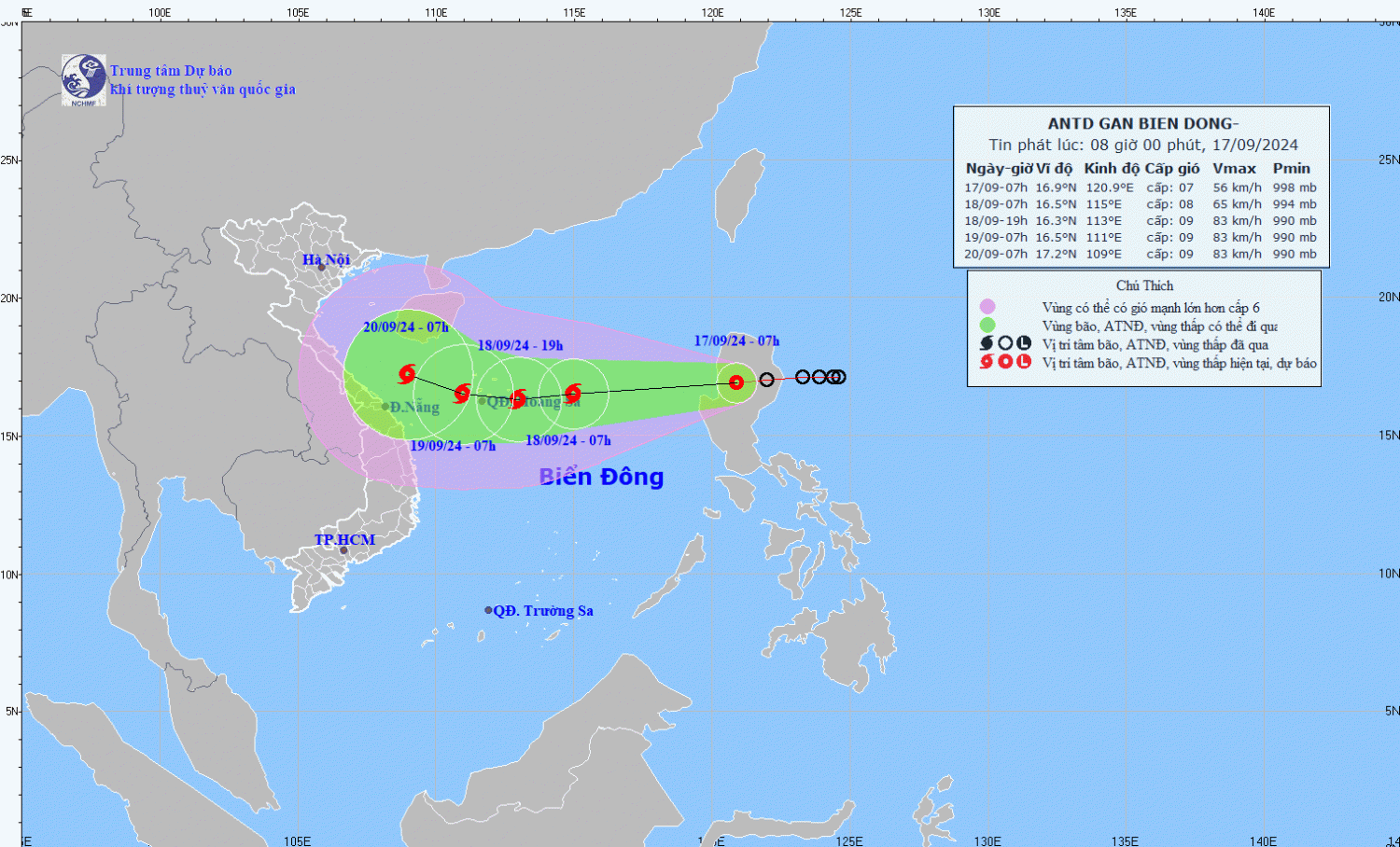 | 07h/19/9 | Tây, 15-20km/h | 16,5N-111,0E; trên khu vực phía Tây quần đảo Hoàng Sa | Cấp 9, giật cấp 10 | 15,0N-19,0N; 109,5E-117,0E | Cấp 3: khu vực Bắc Biển Đông (bao gồm khu vực quần đảo Hoàng Sa) |