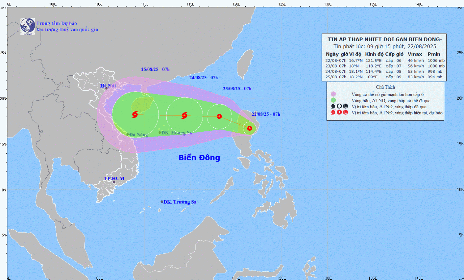 | 07giờ ngày 24/8 | Tây, khoảng 15-20 km/h có khả năng mạnh lên thành bão | 18,1N-114,4E; trên khu vực Bắc Biển Đông, cách đặc khu Hoàng Sa 290km về phía Đông Bắc | 8, giật 11 |