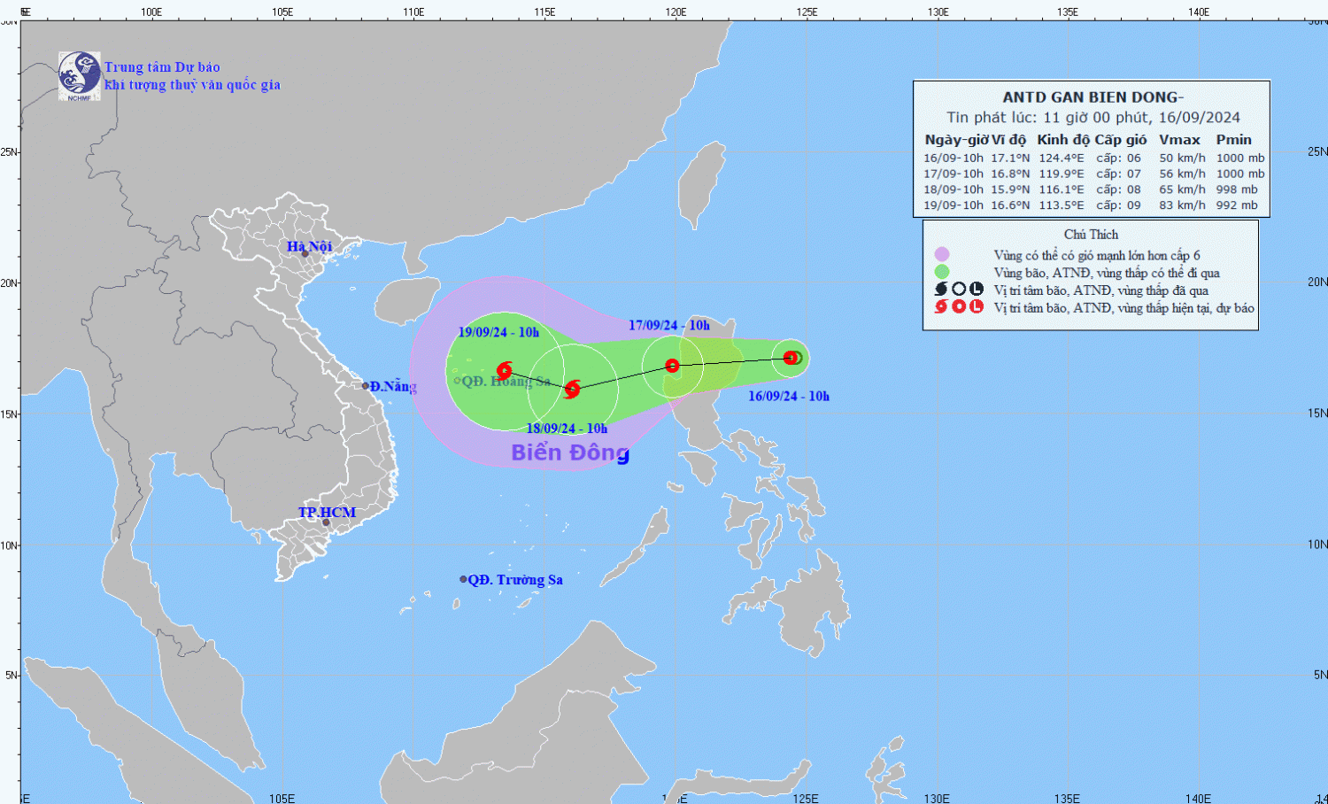 | 10h/18/9 | Tây Tây Nam khoảng 20km/h, mạnh lên thành bão | 15,9N-116,1E; cách quần đảo Hoàng Sa khoảng 400km về phía Đông Đông Nam | Cấp 8, giật cấp 10 | 14,0N-18,0N; 114,0E-118,0E |