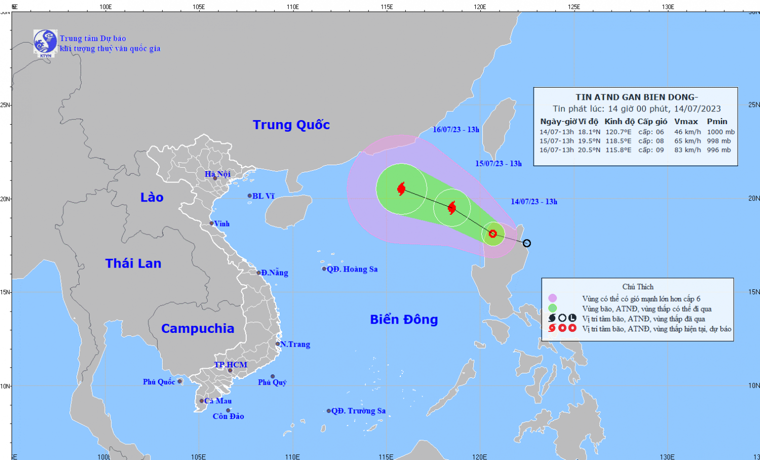 | 13h/15/7 | Tây Tây Bắc, 10-15 km/h và có khả năng mạnh lên thành bão | 19,5N-118,5E; trên khu vực phía Bắc Biển Đông, cách bán đảo Lôi Châu (Trung Quốc), khoảng 880km về phía Đông Đông Nam | cấp 8, giật cấp 10 | 17,5-21,5N; phía Đông kinh tuyến 116,5E | Cấp 3: phía Đông khu vực Bắc Biển Đông |