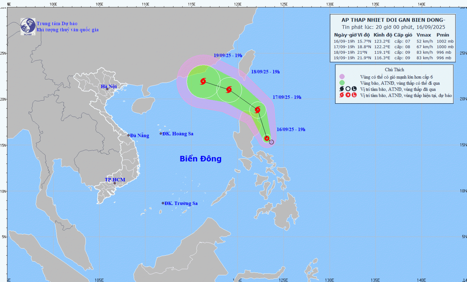 Hiện trạng áp thấp nhiệt đới: Hồi 19 giờ ngày 16/9, vị trí tâm áp thấp nhiệt đới ở vào khoảng 15,7 độ Vĩ Bắc; 123,2 độ Kinh Đông, trên vùng biển phía Đông đảo Lu-Dông (Phi-líp-pin). Sức gió mạnh nhất vùng gần tâm áp thấp nhiệt đới mạnh cấp 7 (50-61km/giờ), giật cấp 9. Di chuyển theo hướng Bắc Tây Bắc với tốc độ khoảng 15km/h.