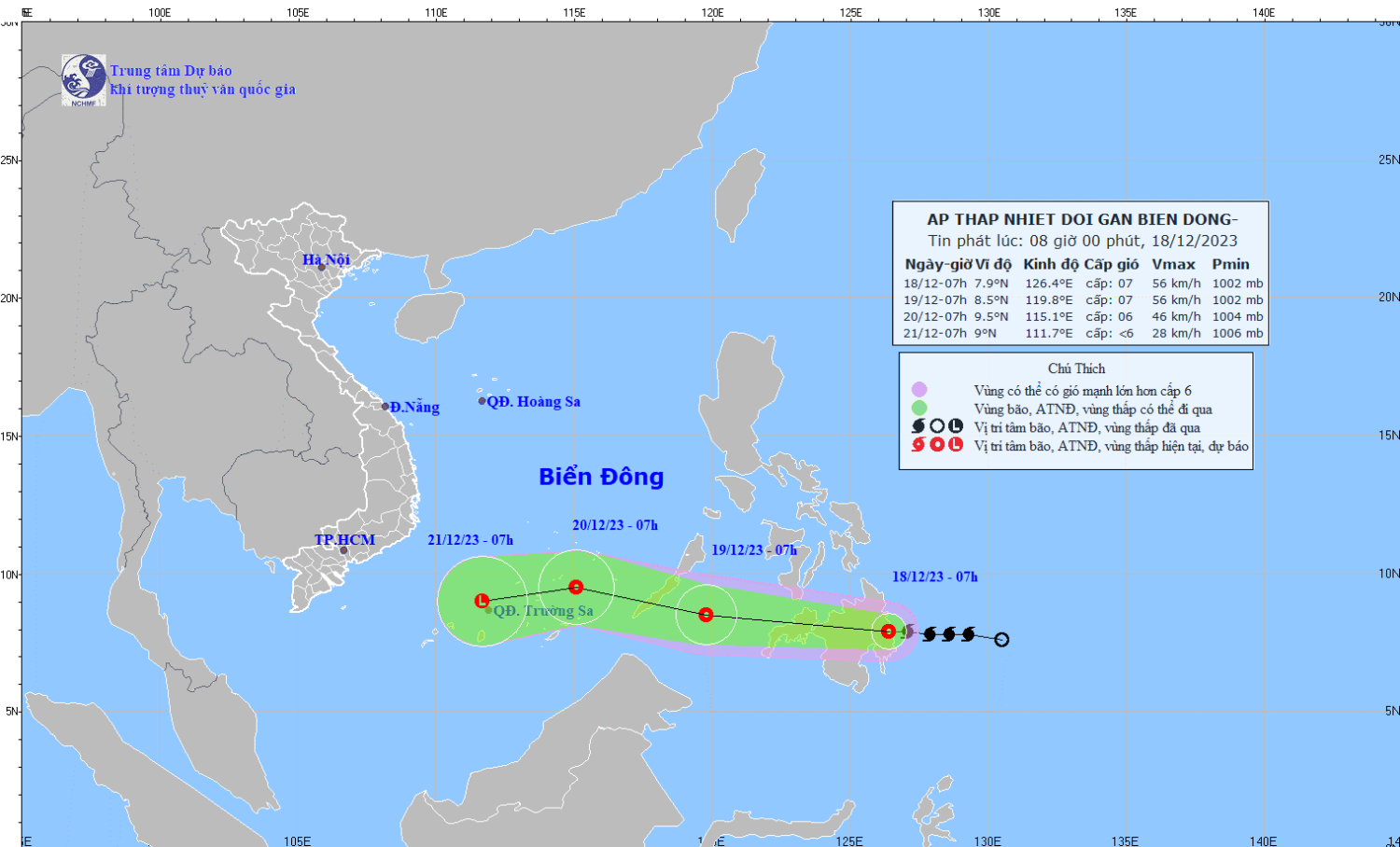 Gió mạnh trên biển: Vùng biển phía Đông Nam khu vực Giữa Biển Đông và phía Đông Bắc khu vực Nam Biển Đông từ đêm 18/12 có gió mạnh dần lên cấp 6, giật cấp 8; biển động.
