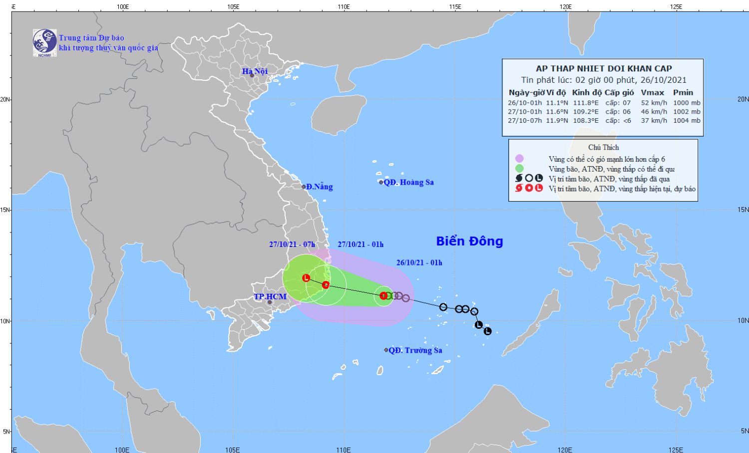 Hồi 01 giờ ngày 26/10, vị trí tâm áp thấp nhiệt đới ở vào khoảng 11,1 độ Vĩ Bắc; 111,8 độ Kinh Đông, cách Khánh Hòa khoảng 310km, cách Ninh Thuận khoảng 290km. Sức gió mạnh nhất vùng gần tâm áp thấp nhiệt đới mạnh cấp 6-7 (40-60km/giờ), giật cấp 9. Bán kính gió mạnh từ cấp 6, giật từ cấp 8 trở lên khoảng 100km tính từ tâm áp thấp nhiệt đới.