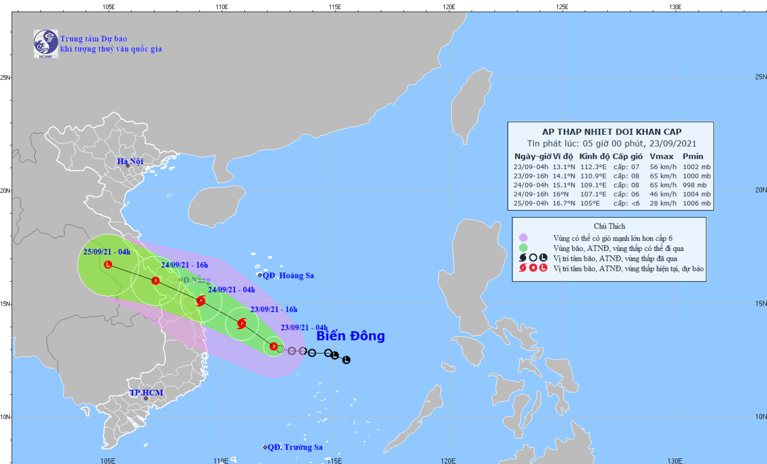 Hồi 04 giờ ngày 23/9, vị trí tâm áp thấp nhiệt đới ở vào khoảng 13,1 độ Vĩ Bắc; 112,3 độ Kinh Đông, cách bờ biển Phú Yên khoảng 330km, cách bờ biển Bình Định khoảng 340km, cách bờ biển Đà Nẵng khoảng 560km. Sức gió mạnh nhất vùng gần tâm áp thấp nhiệt đới mạnh cấp 6-7 (40-60km/giờ), giật cấp 9. Bán kính gió mạnh cấp 6, giật cấp 8 khoảng 100km tính từ tâm áp thấp nhiệt đới.