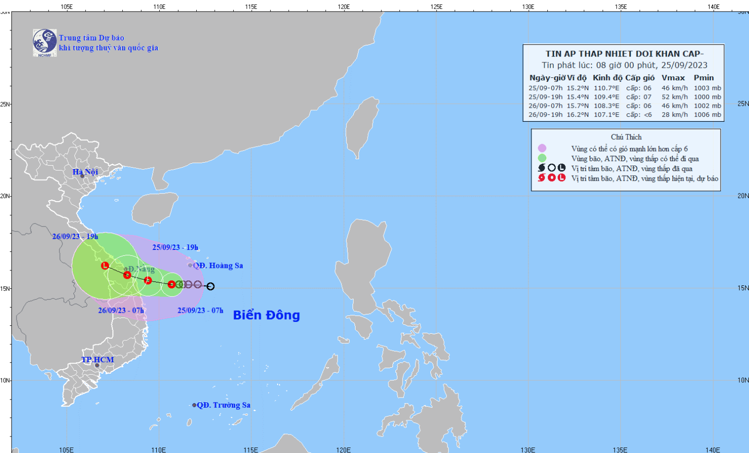 | 19h/25/9 | Tây Tây Bắc, 10-15 km/h | 15,4N-109,4E; trên vùng biển từ Đà Nẵng đến Quảng Ngãi. | 6-7, giật 9 | 13,0-17,5N; Phía Tây kinh tuyến 112,5E |