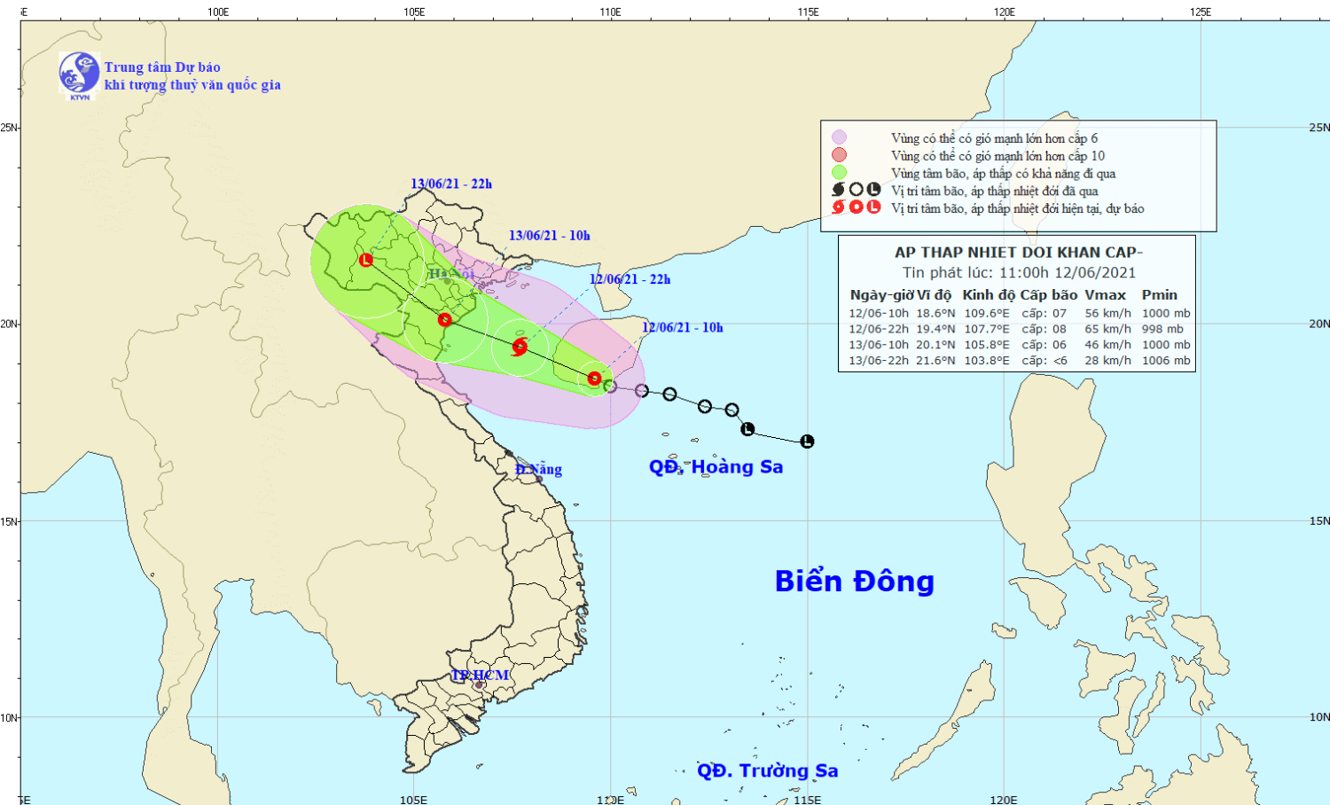 Dự báo trong 12 giờ tới, áp thấp nhiệt đới di chuyển theo hướng Tây Tây Bắc, mỗi giờ đi được 15-20km, đi vào Vịnh Bắc Bộ và có khả năng mạnh lên thành bão. Đến 22 giờ ngày 12/6, vị trí tâm bão ở khoảng 19,4 độ Vĩ Bắc; 107,7 độ Kinh Đông, cách huyện đảo Bạch Long Vĩ khoảng 120 km về phía Nam. Sức gió mạnh nhất vùng gần tâm bão mạnh cấp 8 (60-75km/giờ), giật cấp 10.