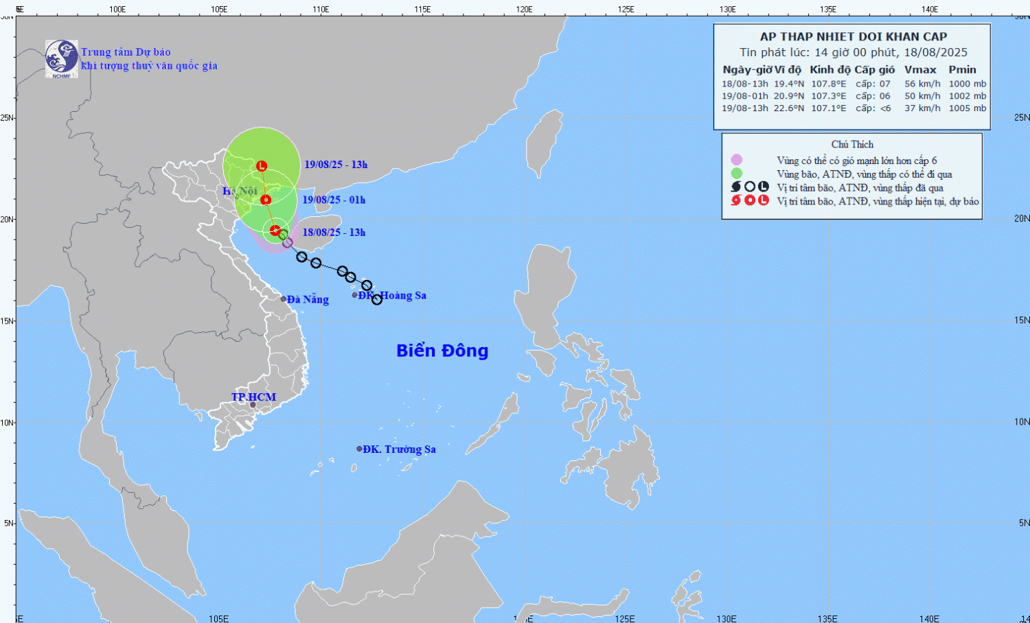 Hình1. Bản đồ dự báo quỹ đạo và cường độ áp thấp nhiệt đới lúc 14h00 ngày 18/8/2025