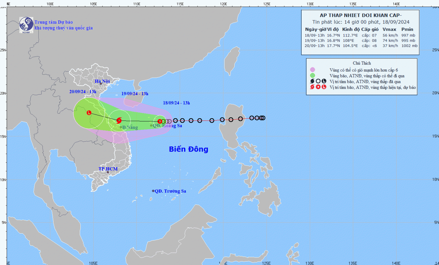 | 13h/19/9 | Tây, khoảng 20km/h, mạnh lên thành bão | 16,8 N-108,0E; trên vùng biển ven bờ từ Quảng Trị đến Quảng Nam | Cấp 8, giật cấp 10 | 15,0N- 19,0N; phía Tây kinh tuyến 115.0E | Cấp 3: Vùng biển phía Tây khu vực Bắc Biển Đông (bao gồm khu vực quần đảo Hoàng Sa); vùng biển và đất liền từ Hà Tĩnh đến Quảng Ngãi (bao gồm đảo Lý Sơn, Cù Lao Chàm, Cồn Cỏ) |