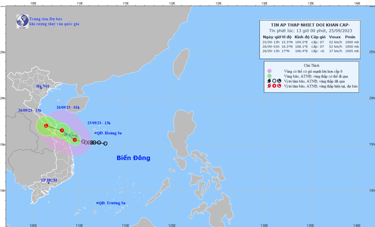 Hồi 13 giờ ngày 25/9, vị trí tâm áp thấp nhiệt đới ở vào khoảng 15,5 độ Vĩ Bắc; 109,5 độ Kinh Đông, cách Đà Nẵng khoảng 150km về phía Đông Đông Nam, cách Quảng Ngãi khoảng 80km về phía Đông Đông Bắc. Sức gió mạnh nhất vùng gần tâm áp thấp nhiệt đới mạnh cấp 6-7 (39-61km/giờ), giật cấp 8-9. Di chuyển theo hướng Tây Tây Bắc với tốc độ 15km/h.