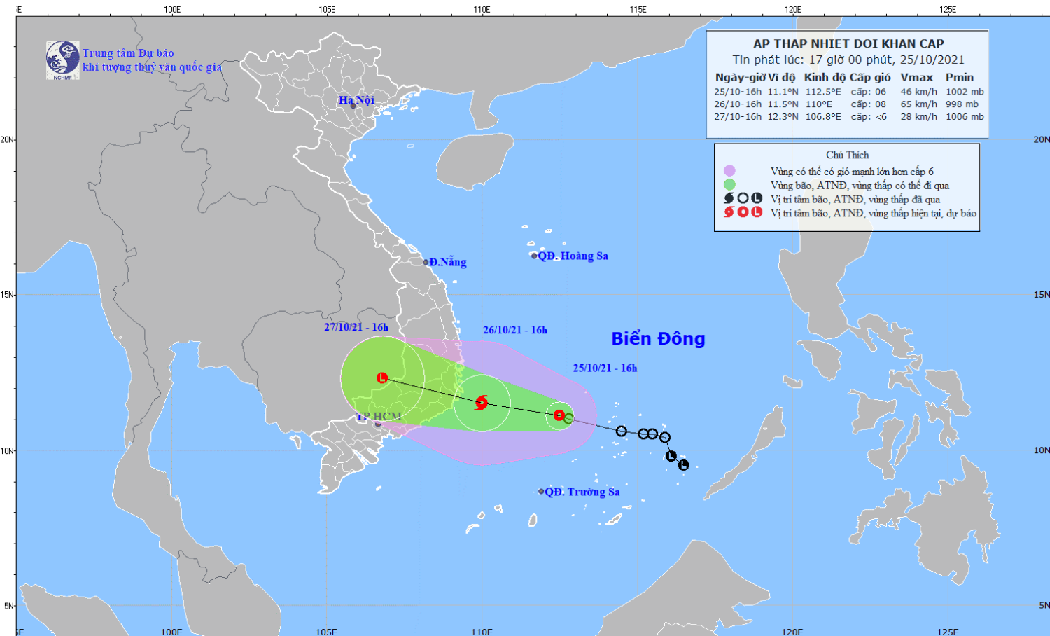 Hồi 16 giờ ngày 25/10, vị trí tâm áp thấp nhiệt đới ở vào khoảng 11,1 độ Vĩ Bắc; 112,5 độ Kinh Đông, cách Khánh Hòa khoảng 380km, cách Ninh Thuận khoảng 370km. Sức gió mạnh nhất vùng gần tâm áp thấp nhiệt đới mạnh cấp 6 (40-50km/giờ), giật cấp 8. Bán kính gió mạnh cấp 6, giật cấp 8 khoảng 80km tính từ tâm áp thấp nhiệt đới.