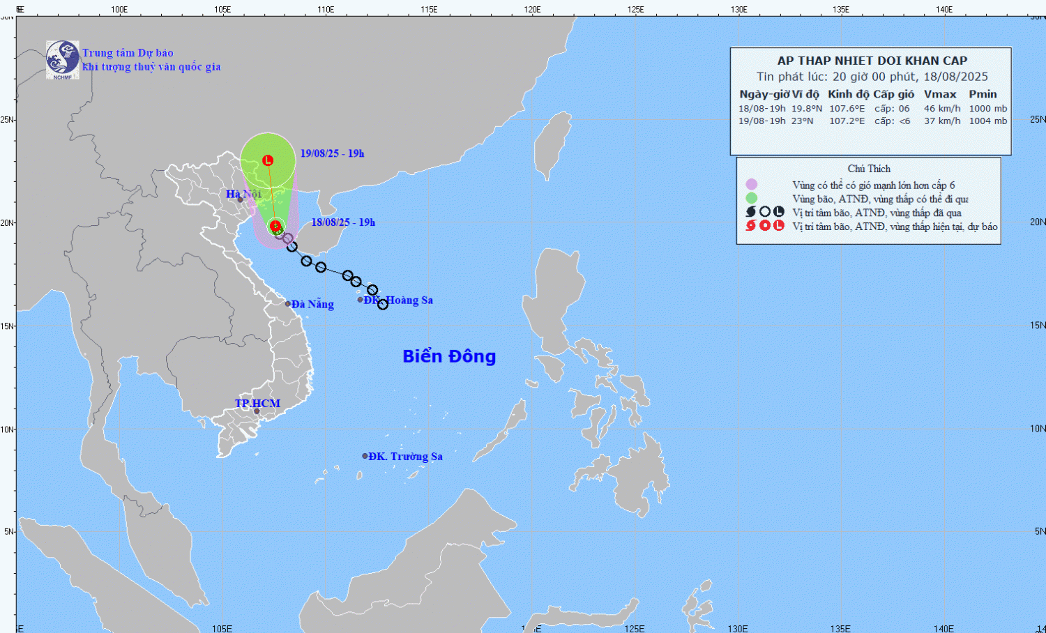 Hình1. Bản đồ dự báo quỹ đạo và cường độ áp thấp nhiệt đới lúc 20h00 ngày 18/8/2025