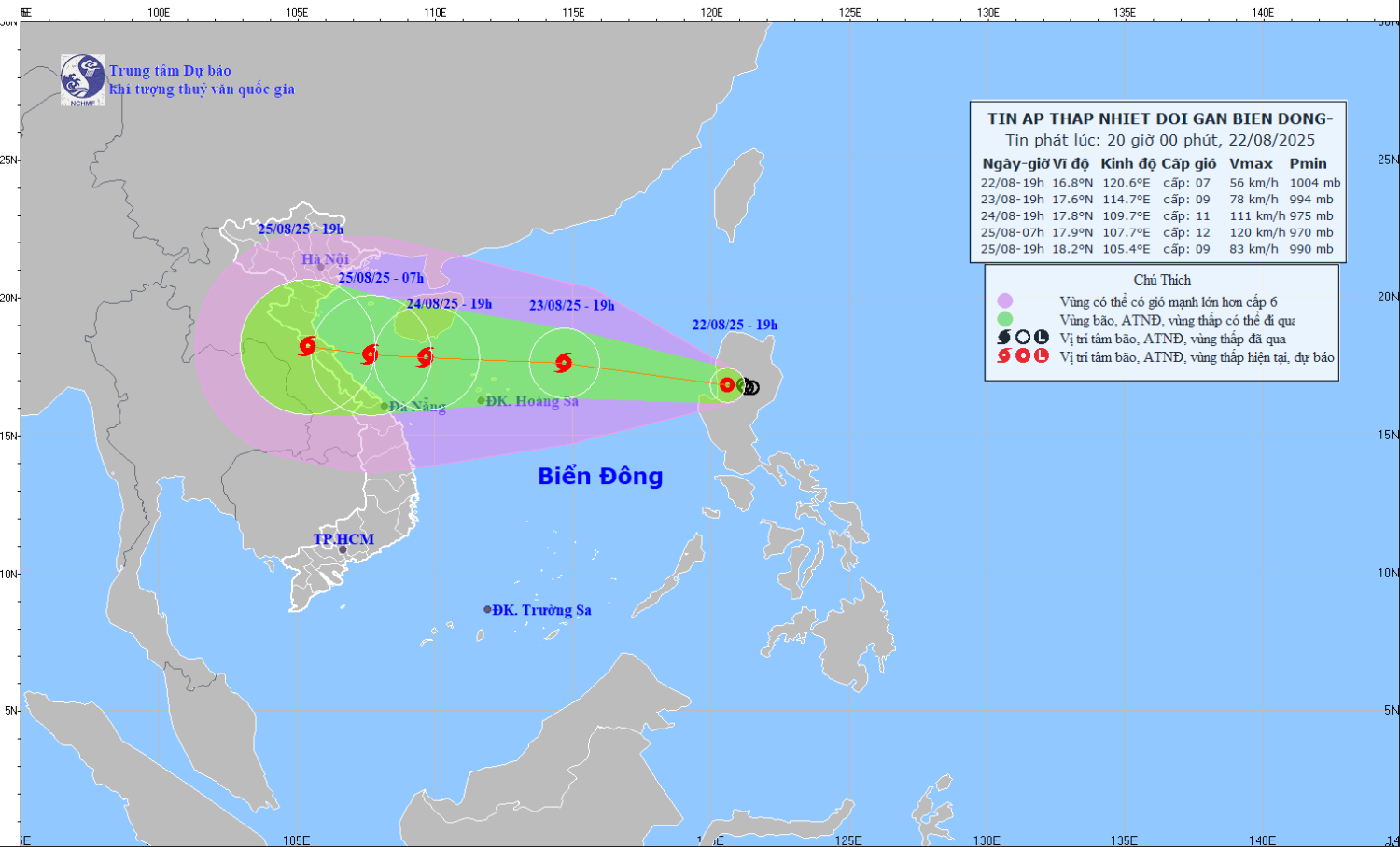Hiện trạng áp thấp nhiệt đới: Hồi 19 giờ ngày 22/8, vị trí tâm áp thấp nhiệt đới ở vào khoảng 16,8 độ Vĩ Bắc; 120,6 độ Kinh Đông, trên đất liền đảo phía Tây Lu-Dông (Philippin). Sức gió mạnh nhất ở vùng gần tâm áp thấp nhiệt đới mạnh cấp 6-7 (39-61km/h), giật cấp 9; di chuyển theo hướng Tây Tây Bắc với tốc độ 15-20km/h.