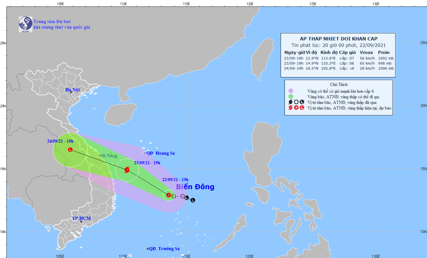 Hồi 19 giờ ngày 22/9, vị trí tâm áp thấp nhiệt đới ở vào khoảng 12,9 độ Vĩ Bắc; 113,6 độ Kinh Đông, cách bờ biển Khánh Hòa khoảng 500km, cách bờ biển Bình Định khoảng 520km, cách bờ biển Đà Nẵng khoảng 700km. Sức gió mạnh nhất vùng gần tâm áp thấp nhiệt đới mạnh cấp 6-7 (40-60km/giờ), giật cấp 9. Bán kính gió mạnh cấp 6, giật cấp 8 khoảng 100km tính từ tâm áp thấp nhiệt đới.