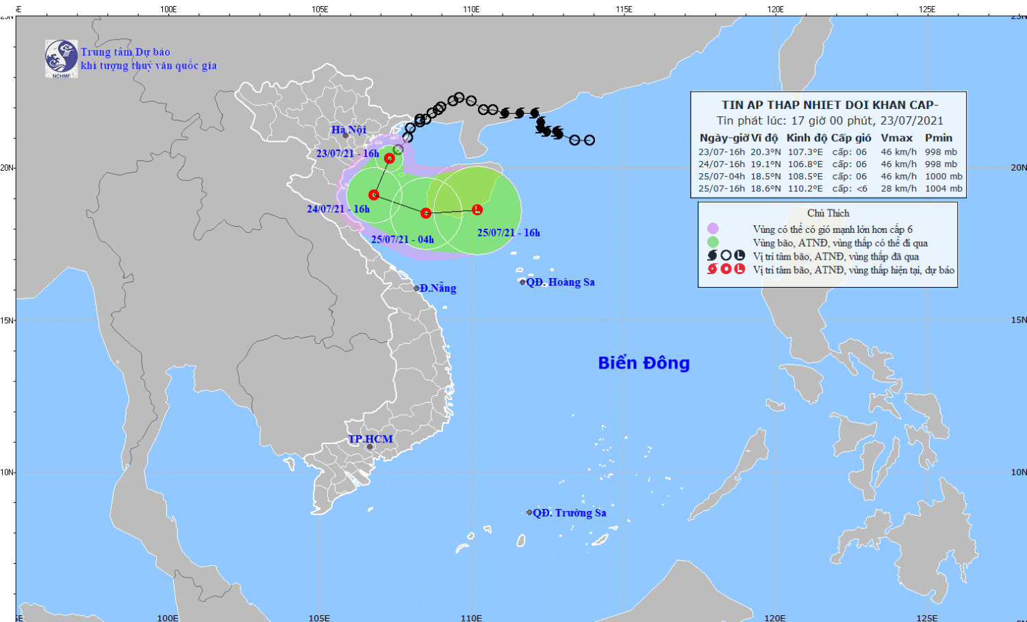 Dự báo trong 24 giờ tới, áp thấp nhiệt đới di chuyển theo hướng Tây Nam, mỗi giờ đi được khoảng 10km. Đến 16 giờ ngày 24/7, vị trí tâm áp thấp nhiệt đới ở khoảng 19,1 độ Vĩ Bắc; 106,8 độ Kinh Đông, cách Nam Định khoảng 130km về phía Đông Nam. Sức gió mạnh nhất vùng gần tâm áp thấp nhiệt đới mạnh cấp 6 (40-50km/giờ), giật cấp 8.