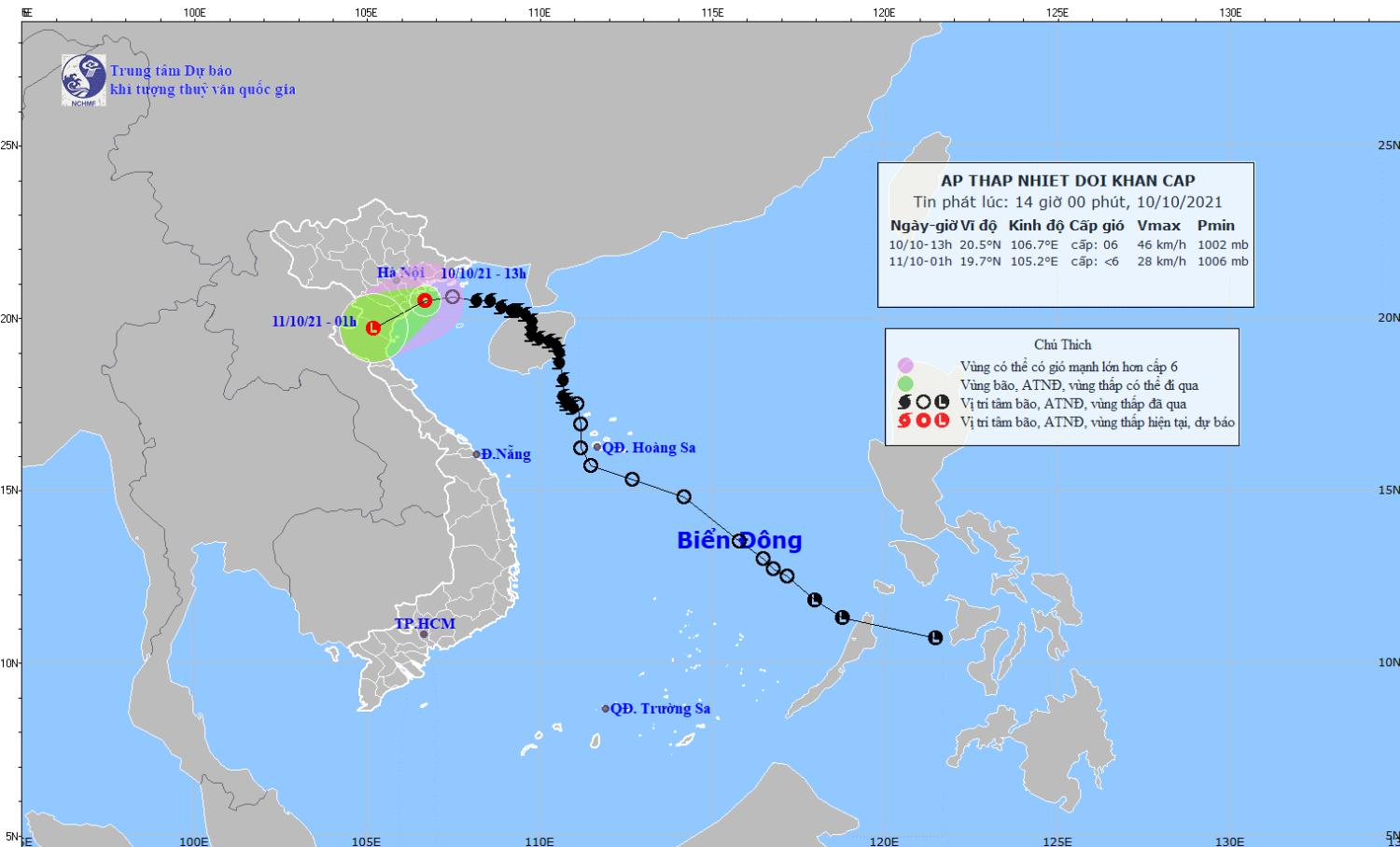 Hồi 13 giờ ngày 10/10, vị trí tâm áp thấp nhiệt đới ở vào khoảng 20,5 độ Vĩ Bắc; 106,7 độ Kinh Đông, ngay trên vùng biển từ Hải Phòng đến Nam Định. Sức gió mạnh nhất vùng gần tâm áp thấp nhiệt đới mạnh cấp 6 (40-50km/giờ), giật cấp 8. Bán kính gió mạnh cấp 6, giật cấp 8 khoảng 50km tính từ tâm áp thấp nhiệt đới.