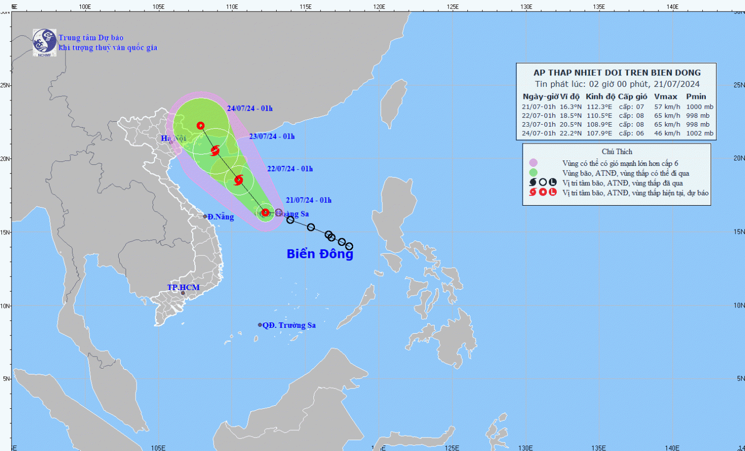 Hồi 01 giờ ngày 21/7, vị trí tâm áp thấp nhiệt đới ở vào khoảng 16,3 độ Vĩ Bắc; 112,3 độ Kinh Đông, trên vùng biển quần đảo Hoàng Sa. Sức gió mạnh nhất vùng gần tâm áp thấp nhiệt đới mạnh cấp 7 (50-61km/h),