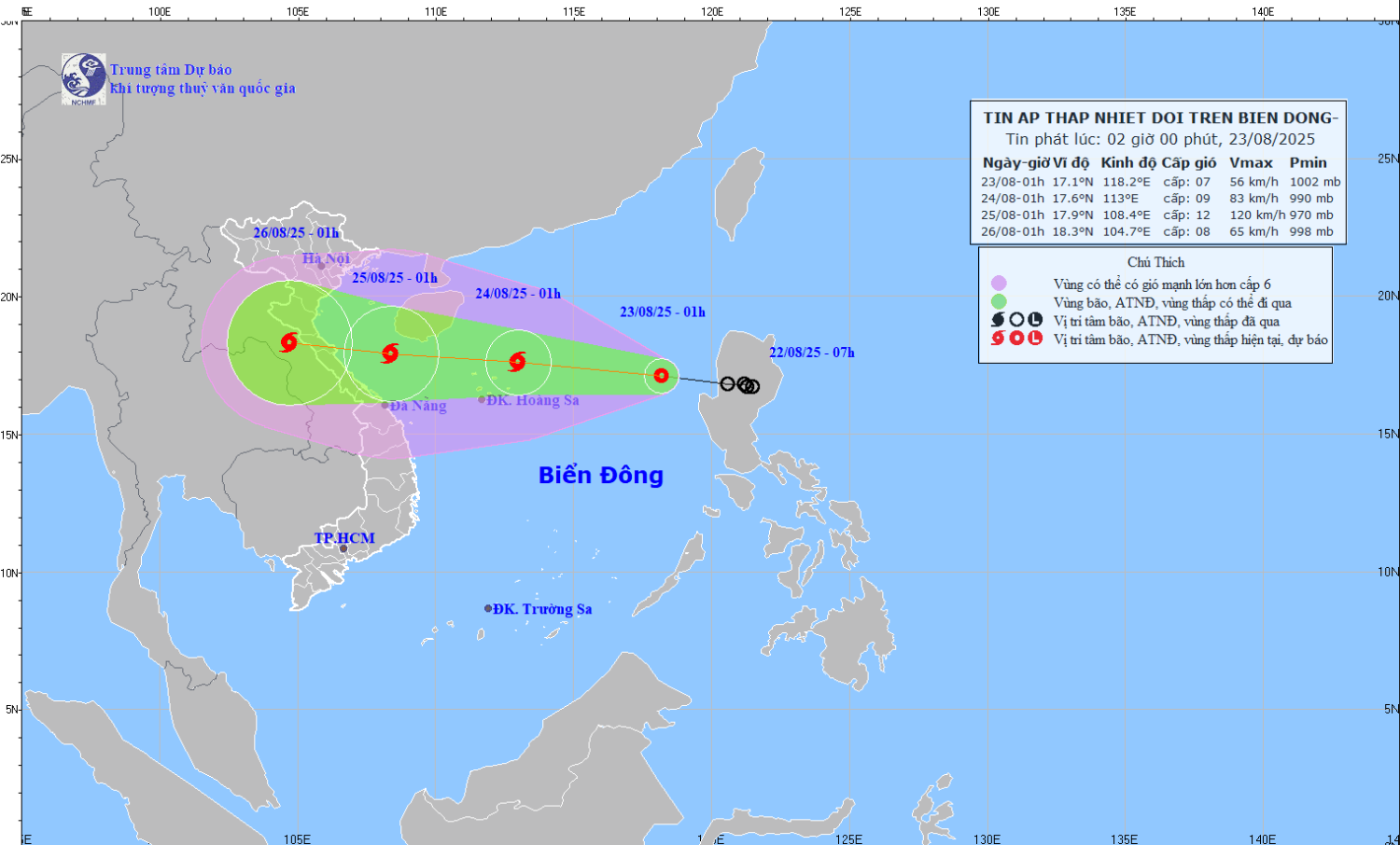 Hiện trạng áp thấp nhiệt đới: Hồi 01 giờ ngày 23/8, vị trí tâm áp thấp nhiệt đới ở vào khoảng 17,1 độ Vĩ Bắc; 118,2 độ Kinh Đông, cách đặc khu Hoàng Sa khoảng 730km về phía Đông. Sức gió mạnh nhất ở vùng gần tâm áp thấp nhiệt đới mạnh cấp 7 (50-61km/h), giật cấp 9; di chuyển theo hướng Tây Tây Bắc với tốc độ khoảng 25km/h.