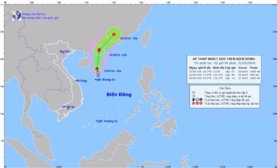 Hồi 01 giờ ngày 31/5, vị trí tâm áp thấp nhiệt đới ở vào khoảng 18,2 độ Vĩ Bắc; 112,0 độ Kinh Đông, trên khu vực phía Bắc quần đảo Hoàng Sa. Sức gió mạnh nhất vùng gần tâm áp thấp nhiệt đới mạnh cấp 6-7 (39-61km/h),