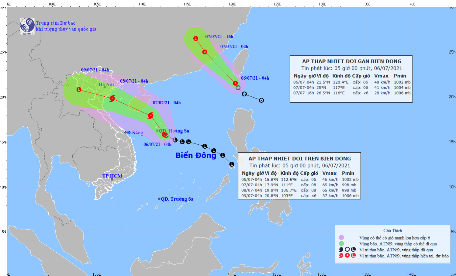Hồi 04 giờ ngày 06/7, vị trí tâm áp thấp nhiệt đới ở vào khoảng 15,8 độ Vĩ Bắc; 112,5 độ Kinh Đông. Sức gió mạnh nhất vùng gần tâm áp thấp nhiệt đới mạnh cấp 6 (39-49km/giờ), giật cấp 8. Bán kính gió mạnh cấp 6, giật cấp 8 khoảng 70 km tính từ tâm áp thấp nhiệt đới.