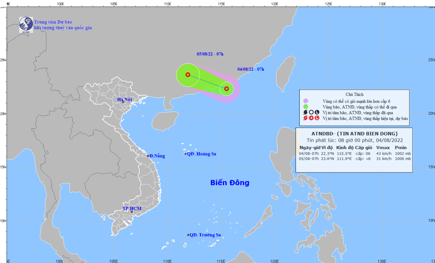 Ngoài ra, do ảnh hưởng của gió mùa Tây Nam có xu hướng hoạt động mạnh dần nên ngày và đêm nay (04/8), ở khu vực Giữa và Nam Biển Đông (bao gồm cả vùng biển quần đảo Trường Sa), vùng biển từ Bình Định đến Cà Mau, Cà Mau đến Kiên Giang và vịnh Thái Lan có mưa rào và dông. Trong mưa dông có khả năng xảy ra lốc xoáy và gió giật mạnh cấp 6-7.
