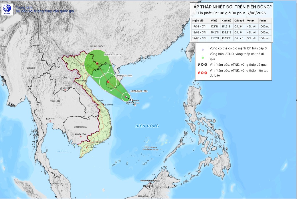 Hình1. Bản đồ dự báo quỹ đạo và cường độ áp thấp nhiệt đới lúc 08h00 ngày 17/8/2025.