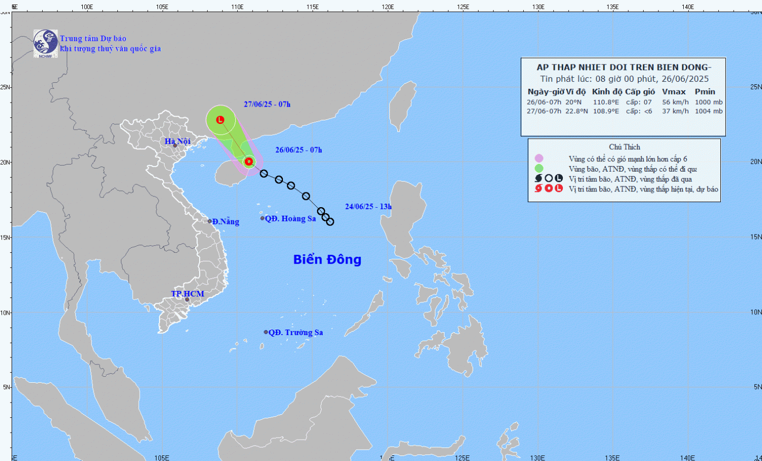 Hiện trạng áp thấp nhiệt đới: Hồi 07 giờ ngày 26/6, vị trí tâm áp thấp nhiệt đới ở vào khoảng 20,0 độ Vĩ Bắc; 110,8 độ Kinh Đông trên vùng bờ biển phía Đông Bắc đảo Hải Nam (Trung Quốc). Sức gió mạnh nhất vùng gần tâm áp thấp nhiệt đới mạnh cấp 6-7 (39-61km/h),