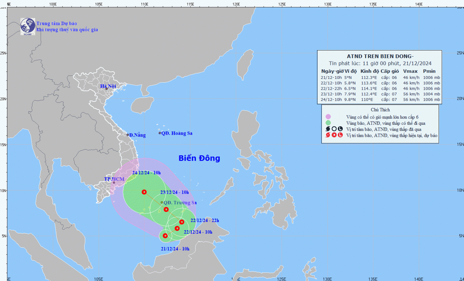 Vùng biển phía Nam của khu vực Nam Biển Đông có gió mạnh cấp 6, giật cấp 8, sóng biển cao 3,0-5,0m; biển động. Từ đêm 22/12, vùng biển phía Nam quần đảo Trường Sa có gió mạnh cấp 6-7, giật cấp 8-9, sóng biển cao 4,0-6,0m; biển động mạnh.