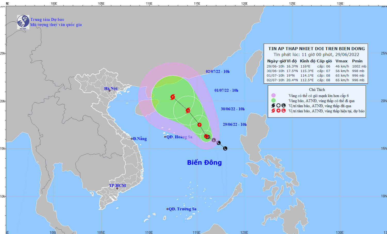 Dự báo trong 24 giờ tới, áp thấp nhiệt đới di chuyển theo hướng Tây Bắc, mỗi giờ đi được 5-10km và có xu hướng mạnh thêm. Đến 10 giờ ngày 30/6, vị trí tâm áp thấp nhiệt đới ở khoảng 17,5 độ Vĩ Bắc; 115,3 độ Kinh Đông, cách quần đảo Hoàng Sa khoảng 410km về phía Đông Đông Bắc. Sức gió mạnh nhất vùng gần tâm áp thấp nhiệt đới mạnh cấp 7 (50-60km/giờ), giật cấp 9.