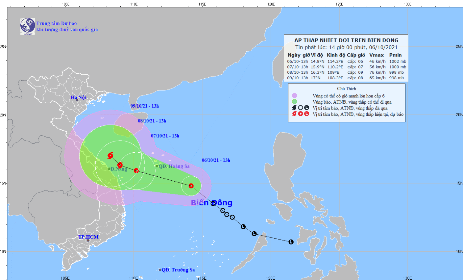 Hồi 13 giờ ngày 06/10, vị trí tâm áp thấp nhiệt đới ở vào khoảng 14,8 độ Vĩ Bắc; 114,2 độ Kinh Đông, cách quần đảo Hoàng Sa khoảng 330km về phía Đông Nam. Sức gió mạnh nhất vùng gần tâm áp thấp nhiệt đới mạnh cấp 6 (40-50km/giờ), giật cấp 8. Bán kính gió mạnh cấp 6, giật cấp 8 khoảng 80km tính từ tâm áp thấp nhiệt đới.