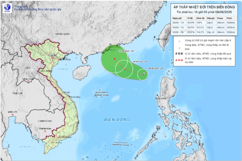 Hiện trạng áp thấp nhiệt đới: Hồi 13 giờ ngày 08/8, vị trí tâm áp thấp nhiệt đới ở vào khoảng 18,9 độ Vĩ Bắc; 118,0 độ Kinh Đông, trên vùng biển phía Đông khu vực Bắc Biển Đông. Sức gió mạnh nhất vùng gần tâm áp thấp nhiệt đới mạnh cấp 6 (39-49km/h), giật cấp 8; di chuyển chậm theo hướng Tây, tốc độ khoảng 5km/h.
