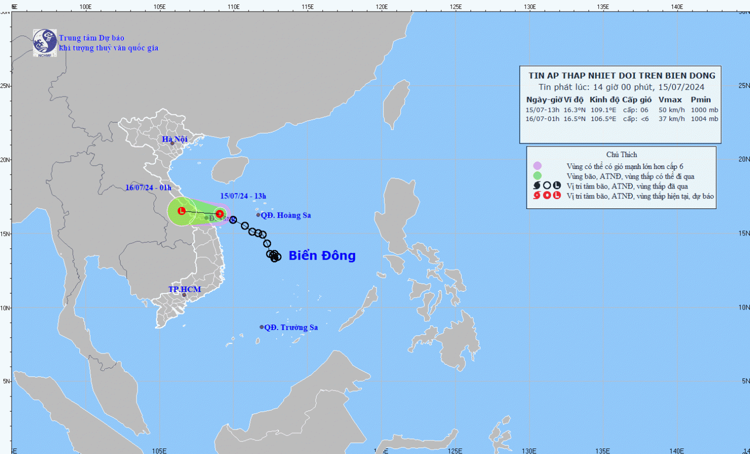 Hiện trạng áp thấp nhiệt đới: Hồi 13 giờ ngày 15/7, vị trí tâm áp thấp nhiệt đới ở vào khoảng 16,3 độ Vĩ Bắc; 109,1 độ Kinh Đông, trên vùng biển Quảng Trị đến Quảng Nam. Sức gió mạnh nhất vùng gần tâm áp thấp nhiệt đới mạnh cấp 6 (39-49km/h),