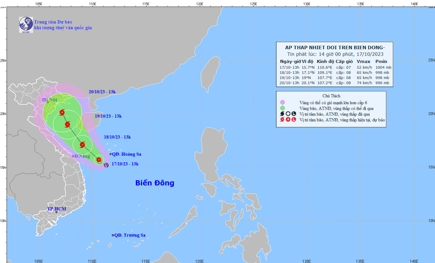Hiện trạng áp thấp nhiệt đới: Hồi 13 giờ ngày 17/10, vị trí tâm áp thấp nhiệt đới ở vào khoảng 15,7 độ Vĩ Bắc; 110,6 độ Kinh Đông, cách quần đảo Hoàng Sa khoảng 160km về phía Tây Nam. Sức gió mạnh nhất vùng gần tâm áp thấp nhiệt đới mạnh cấp 6-7 (39-61km/giờ), giật cấp 9. Di chuyển theo hướng Tây Bắc với tốc độ khoảng 5km/h.