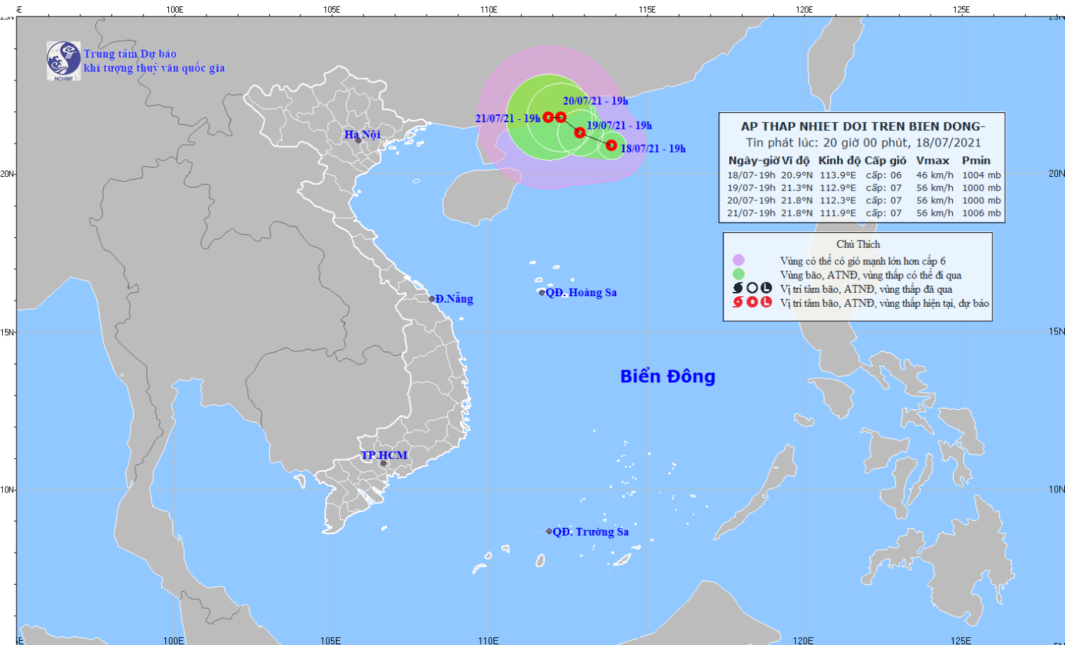 Dự báo trong 24 giờ tới, áp thấp nhiệt đới di chuyển theo hướng Tây Bắc, mỗi giờ đi được khoảng 5km và có khả năng mạnh thêm. Đến 19 giờ ngày 19/7, vị trí tâm áp thấp nhiệt đới ở khoảng 21,3 độ Vĩ Bắc; 112,9 độ Kinh Đông, cách Hồng Kông khoảng 190km về phía Tây Nam. Sức gió mạnh nhất vùng gần tâm áp thấp nhiệt đới mạnh cấp 6-7 (40-60km/giờ), giật cấp 9.