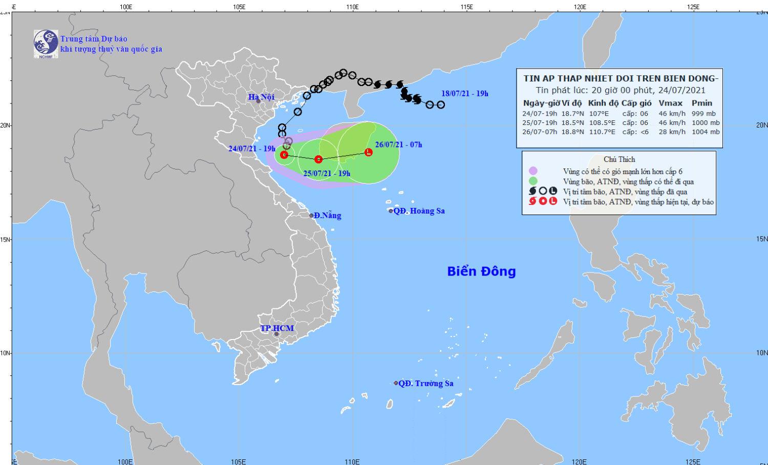 Dự báo trong 24 giờ tới, áp thấp nhiệt đới di chuyển theo hướng Nam sau đổi hướng Đông Đông Nam, mỗi giờ đi được khoảng 5-10km. Đến 19 giờ ngày 25/7, vị trí tâm áp thấp nhiệt đới ở khoảng 18,5 độ Vĩ Bắc; 108,5 độ Kinh Đông, cách đảo Hải Nam (Trung Quốc) khoảng 30km về phía Tây Nam. Sức gió mạnh nhất vùng gần tâm áp thấp nhiệt đới mạnh cấp 6 (40-50km/giờ), giật cấp 8.