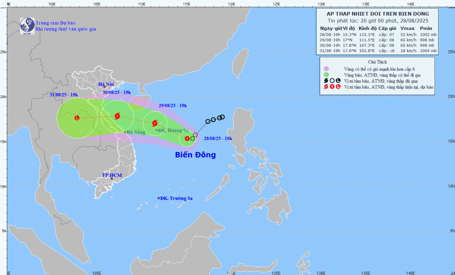 Hiện trạng áp thấp nhiệt đới: Hồi 19 giờ ngày 28/8, vị trí tâm áp thấp nhiệt đới ở vào khoảng 15,3 độ Vĩ Bắc; 115,1 độ Kinh Đông trên khu vực Bắc Biển Đông, cách đặc khu Hoàng Sa khoảng 360km về phía Đông Đông Nam. Sức gió mạnh nhất vùng gần tâm áp thấp nhiệt đới mạnh cấp 6-7 (39-61km/giờ), giật cấp 9. Di chuyển theo hướng Tây với tốc độ 10km/h.