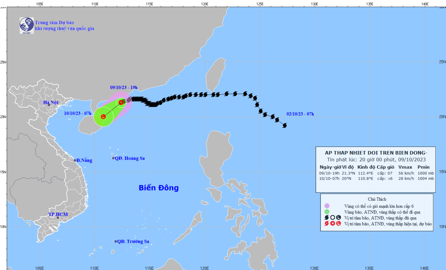 Hồi 19 giờ, vị trí tâm áp thấp nhiệt đới ở vào khoảng 21,3 độ Vĩ Bắc; 112,4 độ Kinh Đông, trên vùng biển phía Nam tỉnh Quảng Đông (Trung Quốc). Sức gió mạnh nhất vùng gần tâm áp thấp nhiệt đới mạnh cấp 6-7 (39-61km/h), giật cấp 9, di chuyển theo hướng Tây Tây Nam với tốc độ khoảng 10km/h.