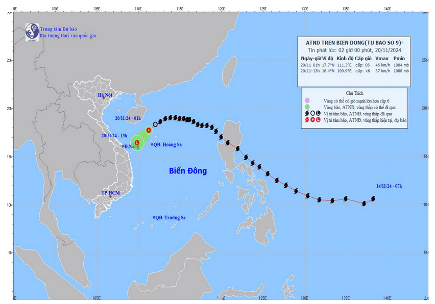 | 13h/20/11 | Tây Nam, khoảng 20km/h, suy yếu thành một vùng áp thấp |