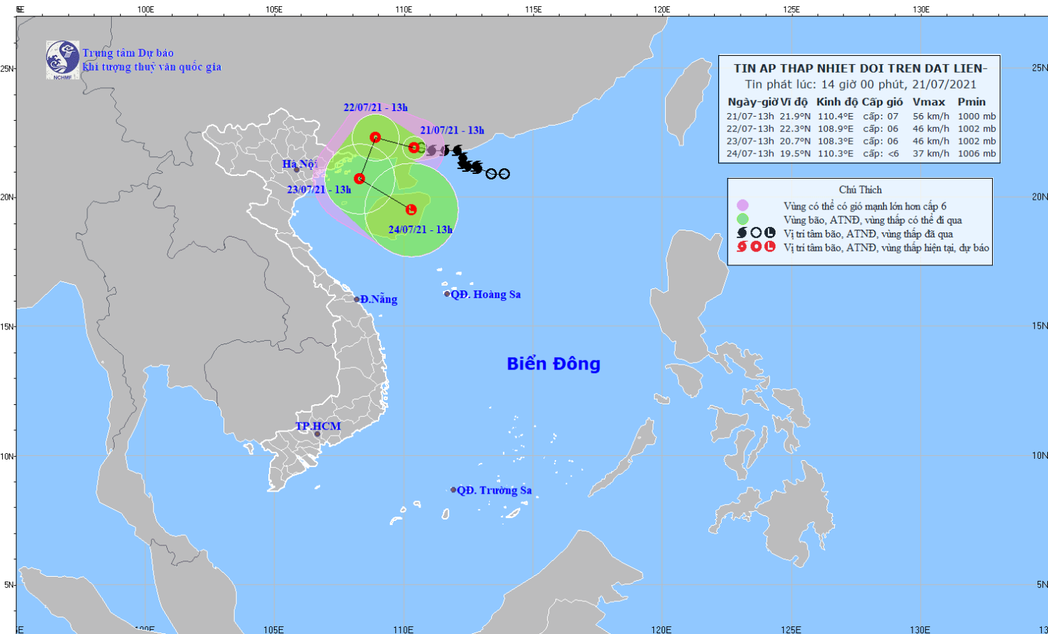 Dự báo trong 24 giờ tới, áp thấp nhiệt đới di chuyển theo hướng Tây Tây Bắc, mỗi giờ đi được 5-10km. Đến 13 giờ ngày 22/7, vị trí tâm áp thấp nhiệt đới ở khoảng 22,3 độ Vĩ Bắc; 108,9 độ Kinh Đông, trên đất liền phía Nam tỉnh Quảng Tây (Trung Quốc), cách Móng Cái (Quảng Ninh) khoảng 130km về phía Đông Bắc. Sức gió mạnh nhất vùng gần tâm áp thấp nhiệt đới mạnh cấp 6 (40-50km/giờ), giật cấp 8.