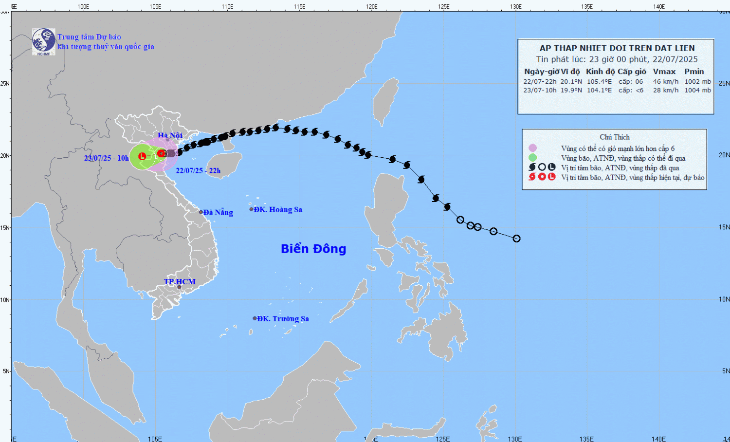 Hiện trạng áp thấp nhiệt đới: Hồi 22 giờ, vị trí tâm áp thấp nhiệt đới ở vào khoảng 20,1 độ Vĩ Bắc; 105,4 độ Kinh Đông, trên đất liền khu vực Ninh Bình-Thanh Hoá. Sức gió mạnh nhất vùng gần tâm áp thấp nhiệt đới mạnh cấp 6 (39-49km/giờ), giật cấp 8, di chuyển theo hướng Tây với tốc độ 5-10km/h.