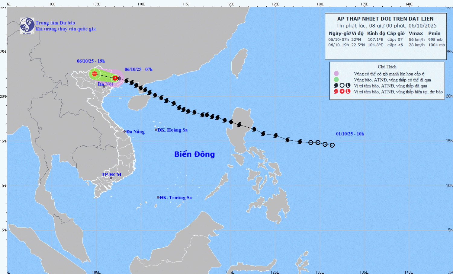 Hiện trạng áp thấp nhiệt đới: Hồi 07 giờ ngày 06/10, vị trí tâm áp thấp nhiệt đới ở vào khoảng 22,0 độ Vĩ Bắc; 107,1 độ Kinh Đông, trên khu vực phía Nam tỉnh Quảng Tây (Trung Quốc). Sức gió mạnh nhất vùng gần tâm áp thấp nhiệt đới mạnh cấp 7 (50-61km/giờ), giật cấp 9. Di chuyển theo hướng Tây, tốc độ 20-25km/h.