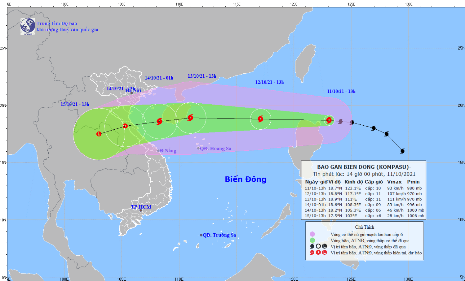 Trong 24 đến 48 giờ tiếp theo, bão di chuyển nhanh theo hướng Tây, mỗi giờ đi được khoảng 25km, đi vào Biển Đông và tiếp tục mạnh thêm. Đến 13 giờ ngày 13/10, vị trí tâm bão ở khoảng 18,9 độ Vĩ Bắc; 111,0 độ Kinh Đông, trên vùng biển phía Đông đảo Hải Nam (Trung Quốc). Sức gió mạnh nhất vùng gần tâm bão mạnh cấp 11 (100-120km/giờ), giật cấp 13.