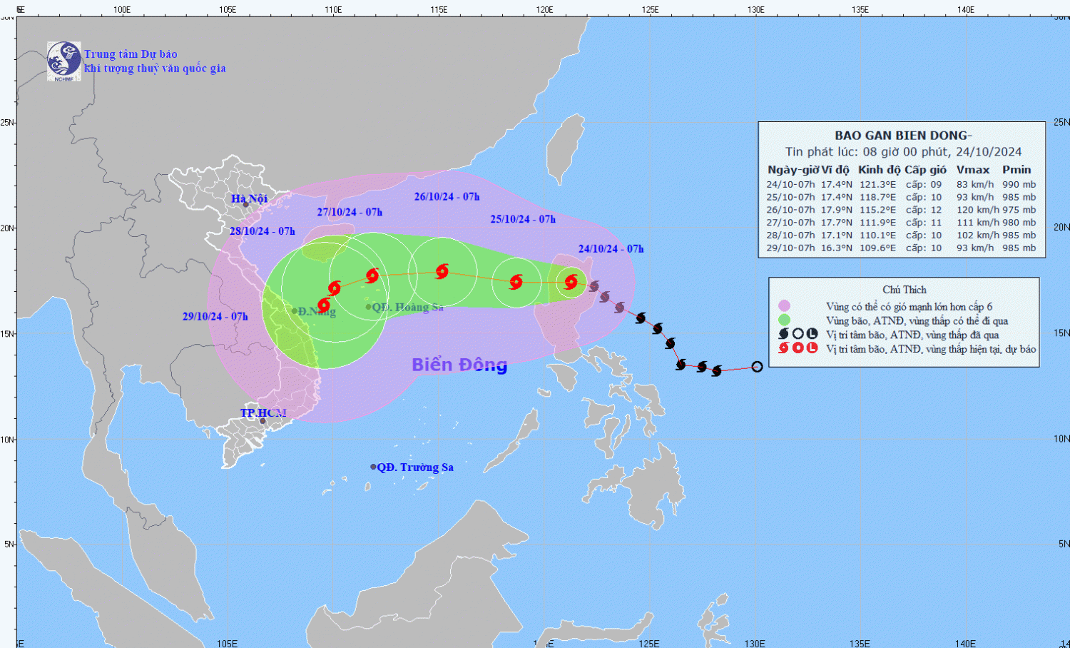 | 07h/25/10 | Tây, 10-15km/h, đi vào Biển Đông |